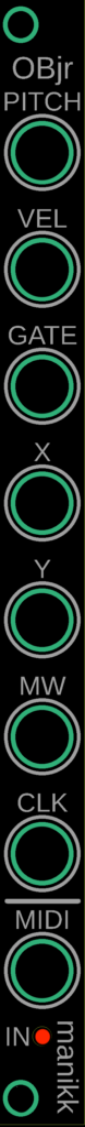 - Mono Voice: Pitch, Velocity and Gate (always tied to pitch,vel,gate jacks)